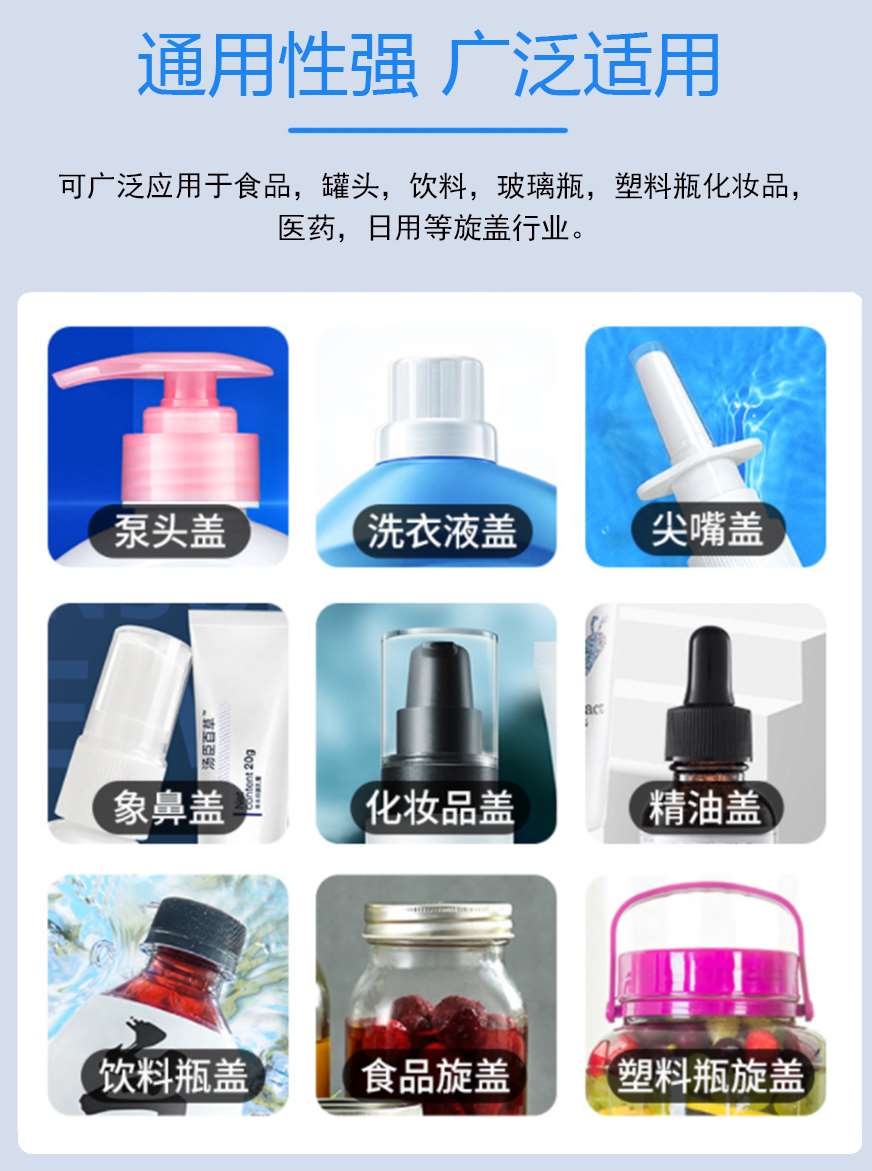 本機主要適用于螺絲紋平頭塑料蓋旋蓋擰緊,例:潤滑油桶、礦泉水瓶、藥瓶、日化用品、飲料瓶等。調節簡單,使用方便。可兼容多種瓶子蓋子。